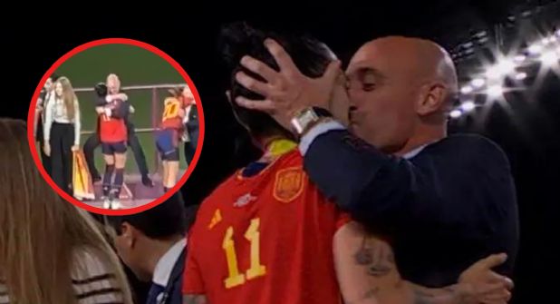 Una vez que vuelve a poner los pies sobre la tarima, Rubiales procede a darle el beso en la boca a Hermoso, lo que generó polémica al no ser un acto consensuado como él ha querido demostrar.