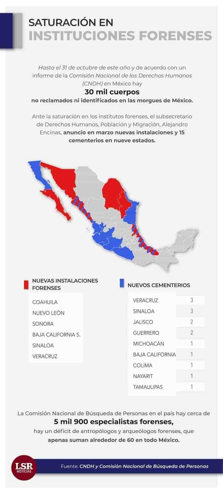 A nivel nacional se cuenta con 217 laboratorios de genética y 263 anfiteatros con una capacidad instalada para almacenar 5,171 cuerpos, lo que implica una sobreocupación de 2,945 cadáveres.