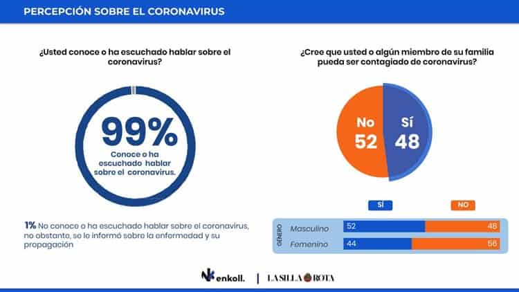 El 99% de las personas encuestadas conoce o ha escuchado hablar del coronavirus. Sin embargo, 52% no cree que algún miembro de su familia pueda resultar contagiado, mientras que 48% dijo que sí.