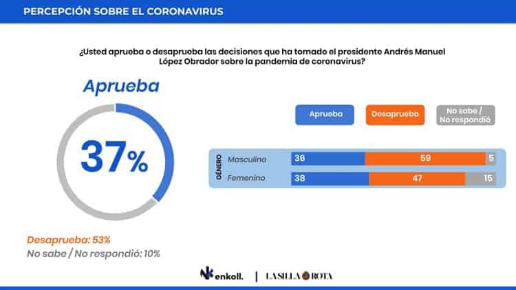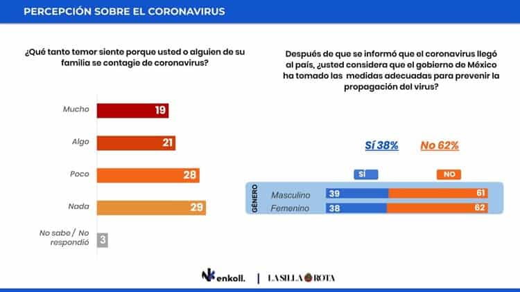 El Gobierno Federal no ha tomado medidas adecuadas para prevenir la propagación del coronavirus (covid-19), de acuerdo con el 62% de encuestados por Enkoll para LA SILLA ROTA y sólo 37% avala las decisiones que ha tomado el presidente Andrés Manuel López Obrador sobre la pandemia.