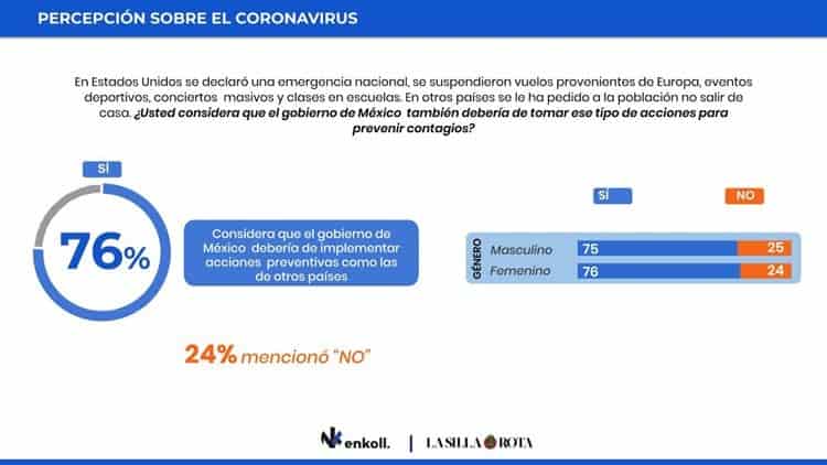 Al mencionar que Estados Unidos declaró emergencia nacional con suspensión de vuelos provenientes de Europa, eventos deportivos, conciertos masivos y clases en escuelas y que en otros países se le ha pedido a la población no salir de sus casas, a los encuestados se les preguntó su el Gobierno de México debería tomar medidas similares para evitar contagios. El resultado fue que 76% consideró que sí se deberían tomar medidas similares. Por género, 75% de hombres y 76% de mujeres apoyaron ese tipo de acciones.