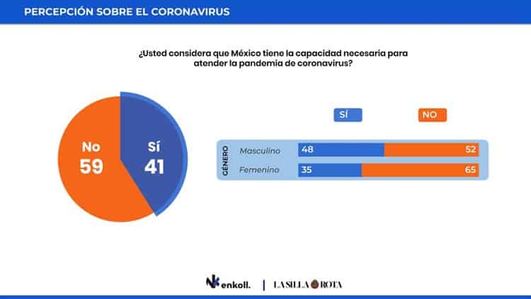 La encuesta telefónica a nivel nacional reveló también que el 59% de los entrevistados considera que el país no cuenta con la capacidad necesaria para atender la pandemia, mientras que 41% afirmó que sí. Por género, el 48% del sexo masculino opinó que México sí cuenta con la capacidad y el 52% dijo que no. El 35% de mujeres dijo que sí se cuenta con la capacidad para enfrentar al coronavirus y 65% dijo que no.