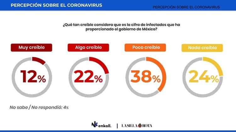 A la pregunta: ¿Qué tan creíble considera que es la cifra de infectados que ha proporcionado el gobierno de México? El 12% dijo que es muy creíble; 22, algo creíble; 38%, poco creíble, y 24% nada creíble.