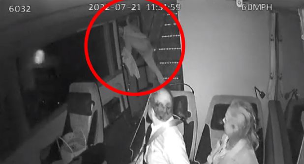 Las cámaras de seguridad del autobús grabaron al sujeto, quien aparentemente estaba intoxicado. Una pareja sentada se alerta de la acción, pero se limita a ver al hombre que saca sus piernas por el hueco abierto, lanzándose al vacío.