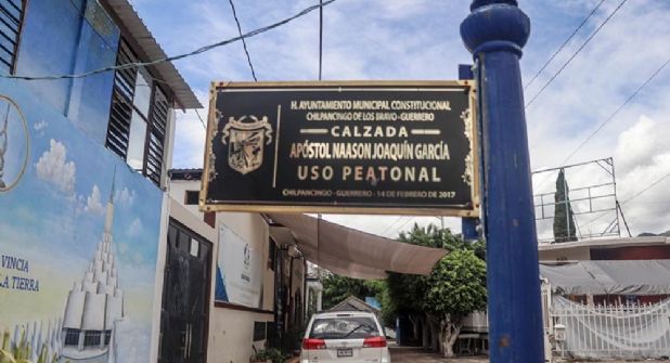 A nombre del cabildo de la capital de Guerrero, Leyva Mena impuso el nombre de Joaquín García en esta calle, ubicada en la colonia Vista Hermosa. “Calzada Apóstol Naasón Joaquín García”, se lee en la placa de la vía que antes tenía otro nombre.
