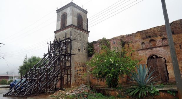 Prueba del asolamiento en Jilotepequillo es su templo colonial, que permanece sin techo, sostenido con vigas y apuntalado por el Instituto Nacional de Antropología e Historia (INAH) para dar paso a una reconstrucción que todavía no empieza.