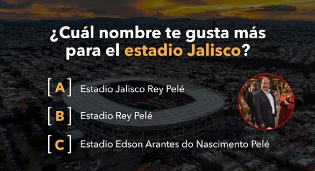 Hasta el momento la publicación ha llegado a 15 mil personas, usuarias de esta red social. Sin embargo, solo han votado 2 mil 161 personas, la opción “Estadio Jalisco Rey Pelé” es la que lleva la delantera con un 61.6 por ciento, en segundo lugar, esta “Estadio Edson Arantes do Nascimento Pelé”, con 19.5 por ciento y en el tercer puesto “Estadio Rey Pelé” con 18.8 por ciento.