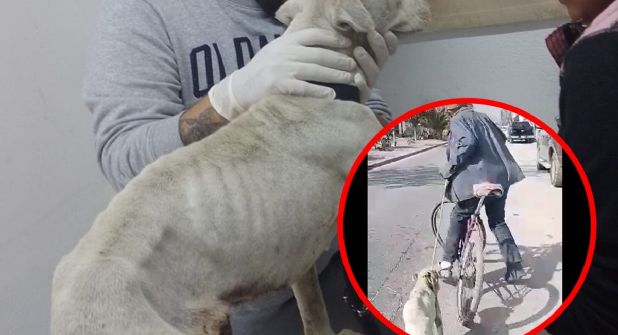 En las imágenes se observa cómo la perrita parecía incapaz de mantenerse en pie mientras era jalada por una correa alrededor de su cuello, que sujetaba el hombre con su mano.