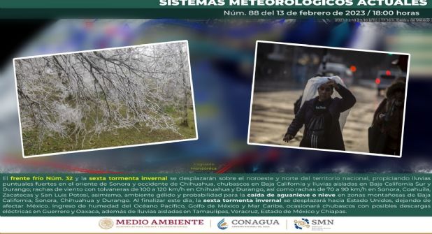 La Comisión Nacional del Agua (Conagua) ha pronóstico el clima para las próximas horas y ha dicho que el frente frío número 32 y la sexta tormenta invernal se desplazarán sobre el noroeste y norte del territorio nacional, propiciando lluvias puntuales fuertes en el oriente de Sonora y occidente de Chihuahua, chubascos en Baja California y lluvias aisladas Baja California Sur y Durango.