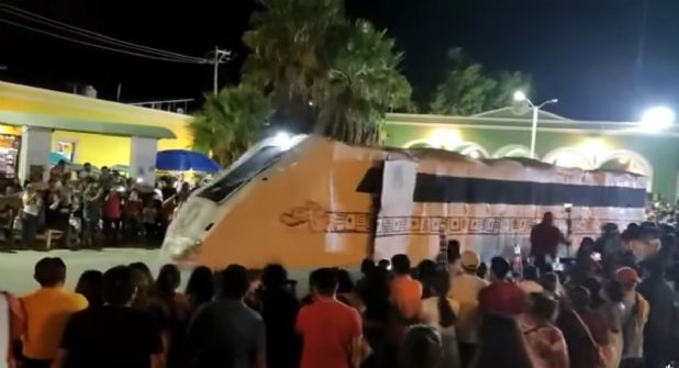 En medio de gritos, risas y aplausos, las personas que “conducían” el vagón iban en zig zag acercándose “peligrosamente” al público hasta que se descarrila. Se trató de una sátira crítica a este megaproyecto insignia del presidente Andrés Manuel López Obrador y su denominada Cuarta Transformación.