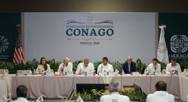 En el evento presidido por Salomón Jara Cruz, presidente de la Conago, también estuvo presente el secretario de Gobernación, Adán Augusto López Hernández.