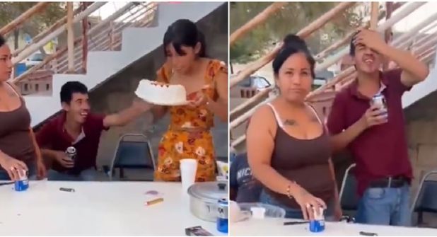 En la grabación se puede observar a la joven quien preocupada por los que querían aventarla para la tradicional mordida del pastel, ella cargó el postre, sin saber que un hombre ebrio que estaba detrás de ella le aventaría el pastel; sin embargo, la reacción del borracho y los invitados en redes fue lo mejor del festejo.