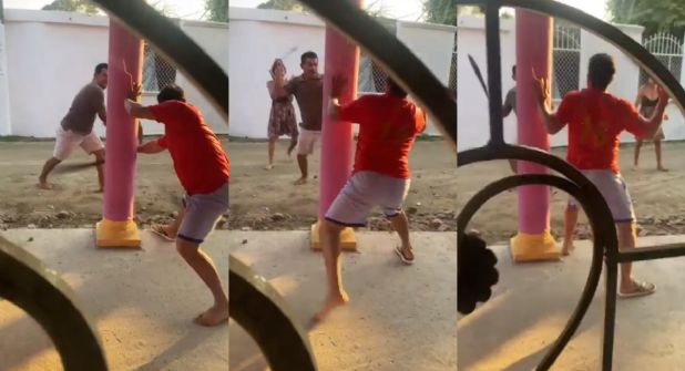 En las imágenes se puede ver a dos hombres adultos que empuñan dos grandes machetes y se lanzan cuchillazos al aire, mientras una mujer desesperada les grita: “¡Papá no!, ¡Papá no!”, en tanto, una mujer dentro de una casa quien presuntamente graba el video junto a otra persona pide un palo para separarlos.