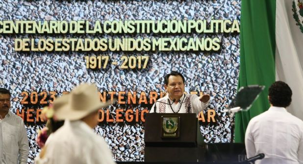 La sesión solemne del Congreso del Estado de Yucatán para la toma de compromiso de Díaz Mena, “Huacho”, se realizó en la Plaza Grande del Centro de Mérida. Las y los diputados se instalaron en la explanada rodeados por el Palacio Municipal, la Catedral y el Palacio de Gobierno.