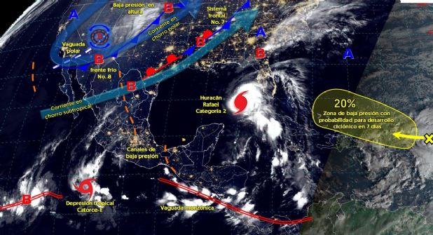 Además del huracán Rafael, el frente frío No. 8 se desplaza sobre el noroeste y gradualmente sobre el norte del país, en interacción con la vaguada polar, con las corrientes en chorro polar y subtropical, así como con un canal de baja presión, el cual se extenderá sobre el norte del país.