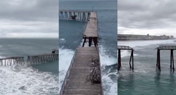 MEXICALI. - El emblemático puente de Rosarito en Baja California fue partido en dos debido al fuerte oleaje que se presentó este lunes 19 de febrero, a través de redes sociales se hizo viral un video donde se muestra que varios metros del puente fue arrancada y quedado partido por la mitad, este día hubo mal clima y el fuerte viento provocó oleaje alto.