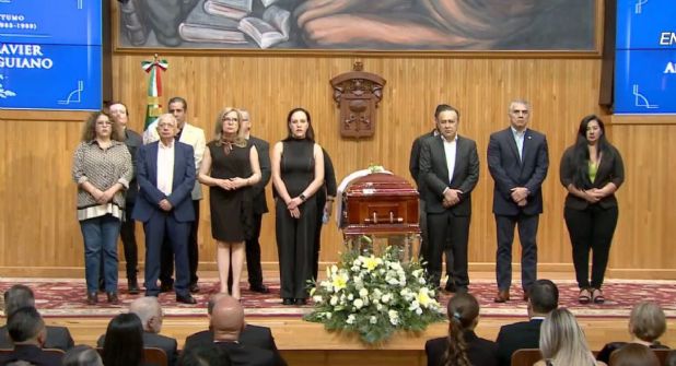 El féretro, fue cubierto con una bandera de la Universidad, hasta que fue despedido, para continuar con los servicios religiosos y después darle el último adiós.