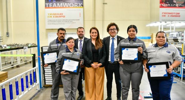 En su visita, la gobernadora realizó un recorrido por la planta y conoció los procesos de producción de la empresa Minth, además de que entregó reconocimientos a los mejores empleados.