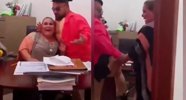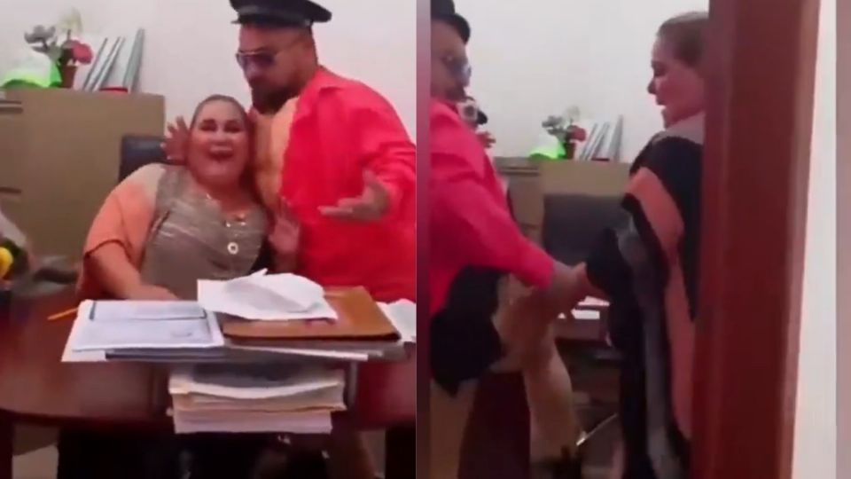 En otra toma del video se puede observar que la regidora de Rioverde, en San Luis Potosí, se pone de pie para bailar con el sujeto al interior de una oficina. De este modo, la mujer se ríe e incluso el hombre que baila disfrazado toma su mano para incitar una acción de “nalgadas”.
