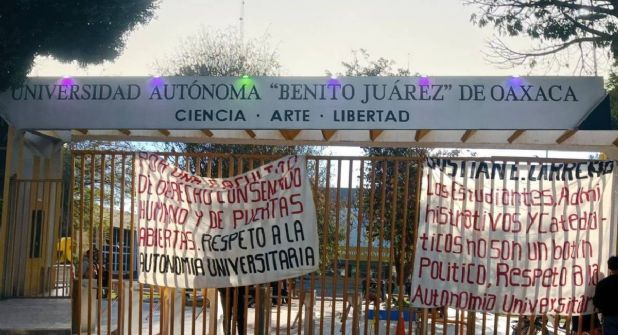 Académicos de la Facultad de Derecho y Ciencias Sociales tomaron este lunes las instalaciones de CU de la Universidad Autónoma Benito Juárez de Oaxaca (UABJO) para exigir el reconocimiento de Freddy Sánchez García como director de dicho plantel.