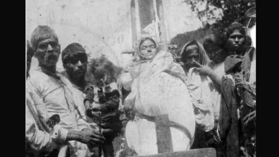 Xichú, Guanajuato.- En su libro “Cerros Abuelos”, Eliazar Velázquez Benavídez documenta cómo se llevaban a cabo los sepelios en Xichú anteriormente, específicamente a principios del siglo pasado. La fotografía titulada “Sepelio de una mujer fallecida en el parto” muestra cómo trasladaban el cuerpo de una mujer fallecida en el parto, amarrada a una camilla hecha de palos, por la Sierra Gorda.