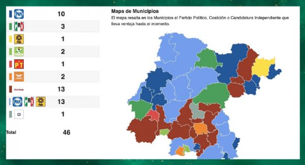 Fueron 13 de los 46 municipios de Guanajuato los que contarán con alcaldes emanados del Movimiento de Regeneración Nacional (Morena), otros 13 por representantes de la coalición PAN-PRI-PRD, 10 más estarán gobernados por el PAN, 3 por el PRI, 2 por MC, 2 por el Partido Verde y con 1 cada uno quedaron PRD, PT y Candidato Independiente.
