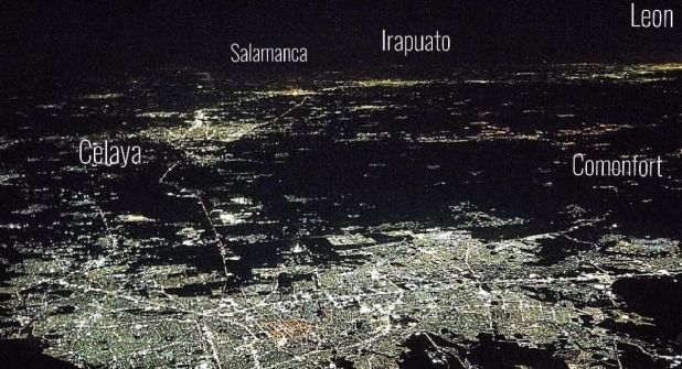 El corredor industrial de Guanajuato está compuesto por León, Irapuato, Salamanca, Celaya, la mancha más grande de luz es la ciudad de Querétaro, a un costado está Comonfort.