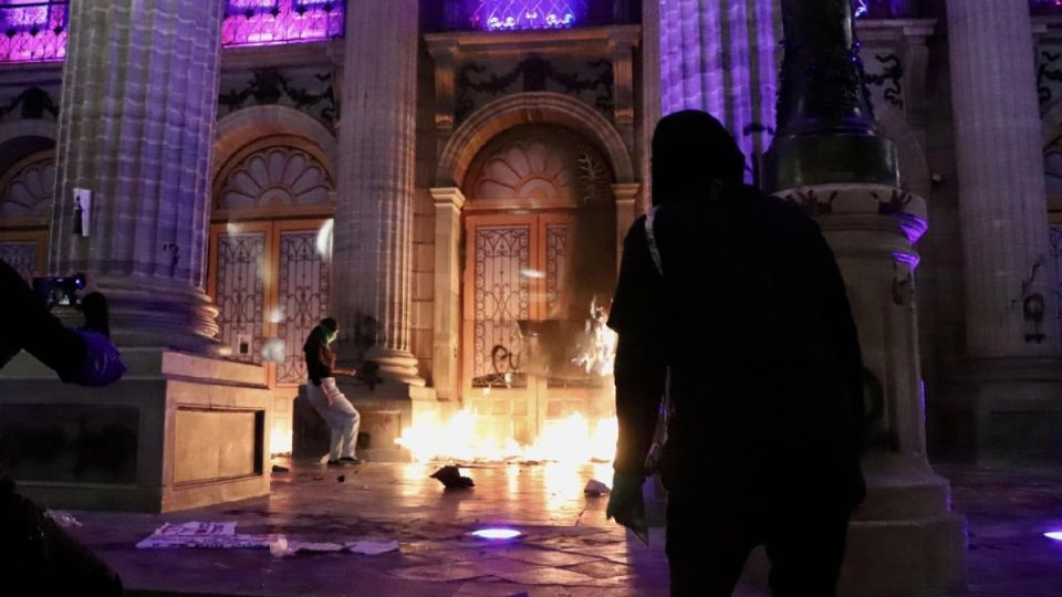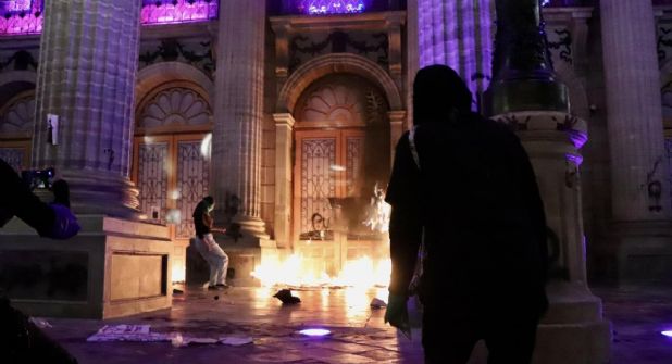 Guanajuato.– En el marco del Día Internacional de la Mujer, sucedió lo mismo que el año pasado, un grupo de manifestantes prendió fuego en el acceso principal del Teatro Juárez, uno de los recintos culturales más emblemáticos de la capital del estado.