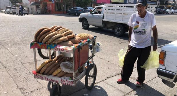 Don Gregorio tiene puesto letrero en su playera con la dirección donde reside y números de teléfonos a los cuales llamar en caso de emergencia, es un adulto mayor, pese a que está enfermo del corazón se dispone a ofrecer su particular alimento: “Para llevar un cinquito a mi casa” dice Don Gregorio quien vende cada hogaza en 48 pesos.