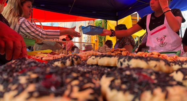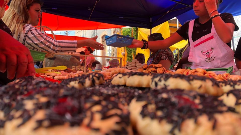 Entre los puestos y el griterío, el aroma a pan se entremezcla con el de las tenerías, las familias panaderas que llegaron desde los diferentes barrios y colonias de la ciudad ofrecieron lo mejor de sus hornos, lo tradicional: las campechanas, los cuernitos, las herraduras, los polvorones, los floreados, los besos, las monjas y los ladrillos… una vasta variedad de minúsculas piezas que acabarán por compartirse en familia, ya sea con café o con leche.