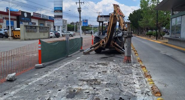 Los trabajos que se realizan consisten en excavación, retiro, suministro de materiales y colocación de concreto nuevo en el carril central y el pegado a banqueta.