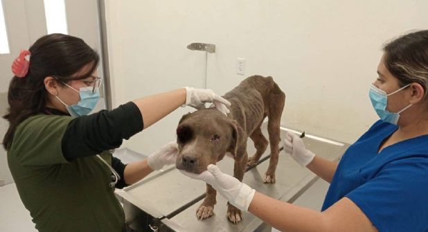 León, Guanajuato.- Con severa desnutrición, un ojo totalmente dañado y en pésimas condiciones de salud fue rescatada la perrita “Muñeca” en León.