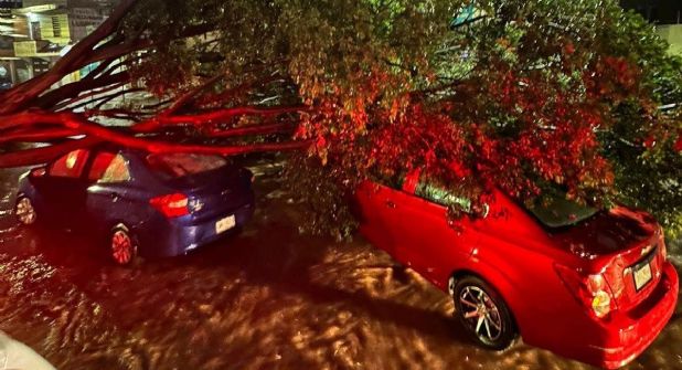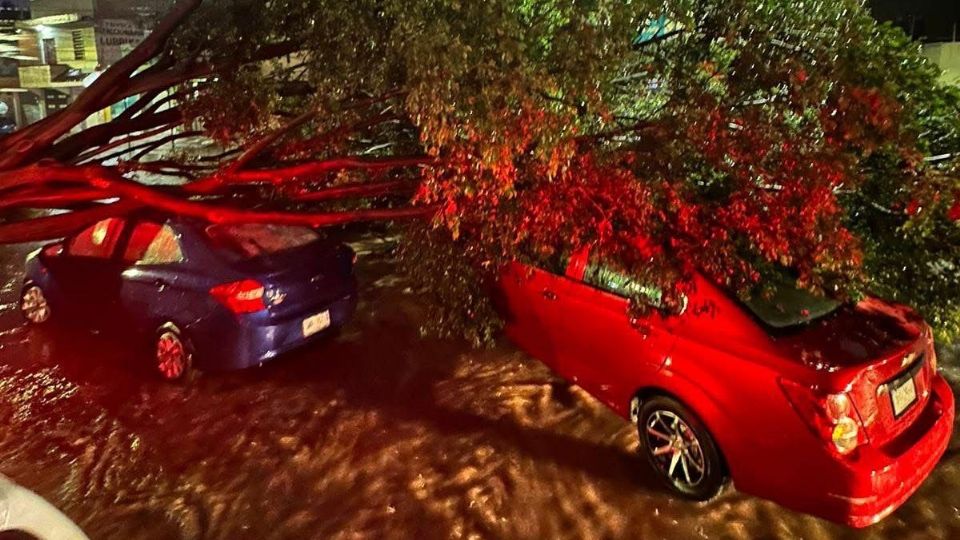 Otro arbol cayó sobre un vehículo en el cruce de Paseo de Jerez y bulevar J.J. Torres Landa. Registró Protección Civil de León.