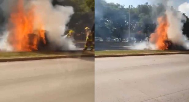 Jóvenes que iban a bordo del transporte público también lograron captar para sus redes sociales, el momento en el cual los Bomberos sofocaban las llamas del auto, las cuales alcanzaron hasta tres metros de altura.