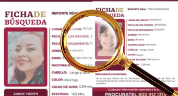 ATITALAQUIA.- Hoy martes 2 de noviembre de 2022 se cumplieron seis días desde que familiares de Sandy Yudith Canto Ramos y su hija desaparecieran en el municipio Atitalaquia, por lo que las autoridades les activaron dos fichas de búsqueda para tratar de dar con su paradero.