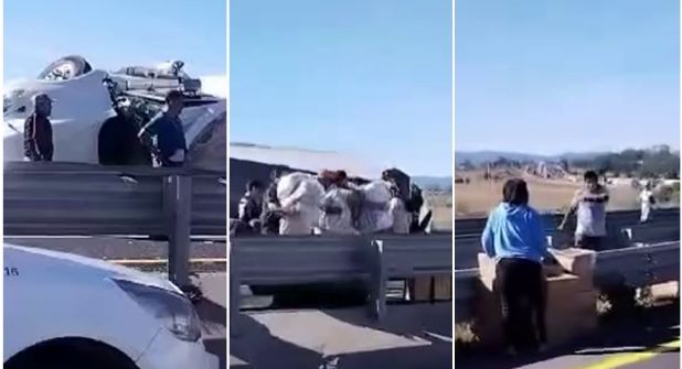 TULA DE ALLENDE.- Un grupo de pobladores del estado de Hidalgo fue captado cometiendo rapiña en un accidente que involucró a tráiler cargado con ropa sobre el autopista Arco Norte, imágenes que de inmediato se volvieron virales, todo sin que la autoridad pudiera hacer algo para contener la situación.