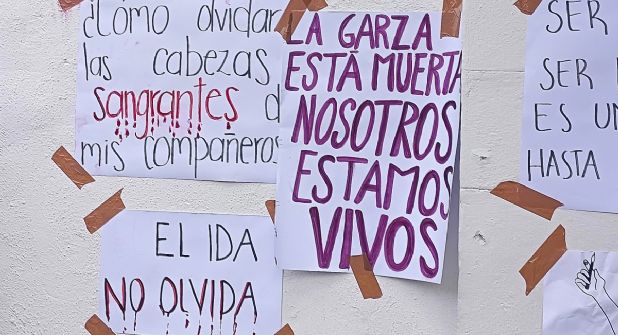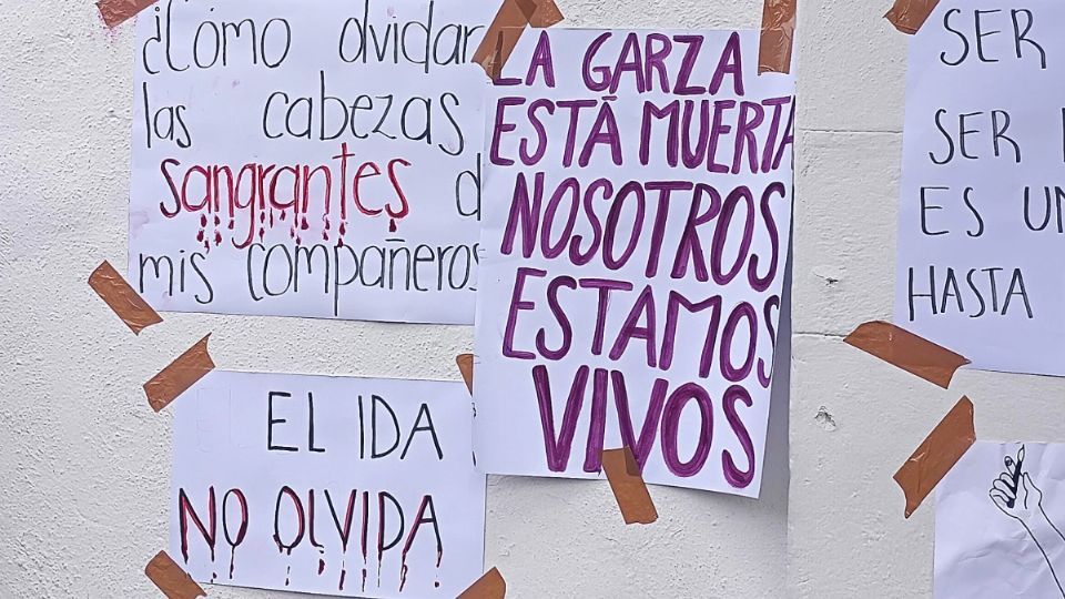 Este jueves, en la fachada de Instituto de Artes, ubicada en la avenida Juárez de Real del Monte, se colocaron carteles en las que se lee “Amor, justicia y revolución”, “Cuando la dictadura es un hecho, la revolución es un derecho”, “El arte no es violencia”, “¡Son estudiantes, no delincuentes! Padres de familia apoyando por el respeto y educación justa para el IDA”.