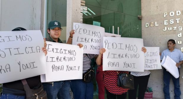 Con pancartas exigen Justicia, "qué no exista impunidad", "libertad para Yoni" y otras frases. Los manifestantes advirtieron que en caso de que el juez no otorgue la libertad inmediata a los dos jóvenes, tomarán otras medidas, tales como cerrar calles y avenidas o huelga de hambre.