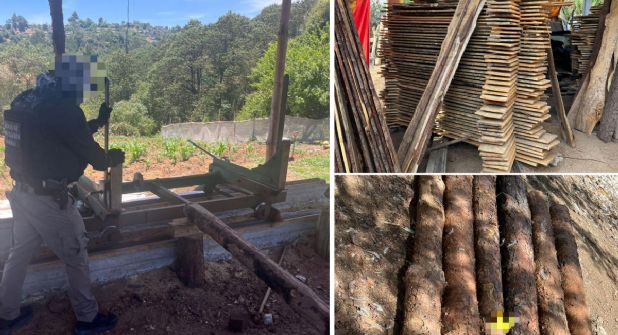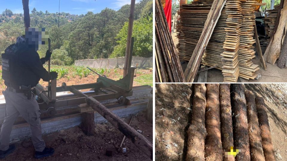 Durante los cateos, los agentes aseguraron 3 torres de aserrío, 2 partes delanteras de vehículos tipo pick up, tres carros tipo empujón, 116 piezas de madera aserrada de pino, 6 rollos de madera de pino de diversas medidas, 659 tablas de madera y 39 polines.