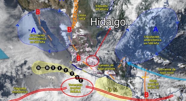 De acuerdo con el Servicio Meteorológico Nacional (SMN), si bien el fenómeno meteorológico Dalila se encuentra frente a las costas de Guerrero y Michoacán, su circulación y desprendimientos nubosos en interacción con un canal de baja presión serán responsables de que sus efectos sigan presentes, por lo que se deben tomar precauciones.