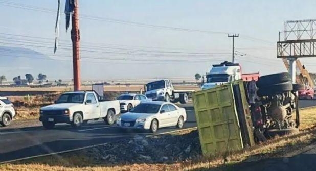 Tolcayuca.- La volcadura de un camión de carga sobre la carretera México–Pachuca, a la altura de Tolcayuca, provocó afectaciones a la circulación en ambos sentidos durante las primeras horas de este día.