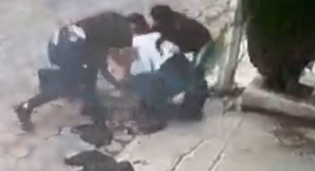 El agresor es derribado por la víctima, y de inmediato una mujer y otro hombre lo ayudan para forcejear con el presunto delincuente a quien golpean y detienen con fuerza impidiendo que escape; mientras el otro sujeto con el que iba acompañado se retira a bordo de la motocicleta y huye de la escena.