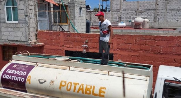 Son solo dos colaboradores de la Caasim que se encargan de manejar la pipa, distribuir el agua, levantar los reportes y tomar evidencia fotográfica. Ellos explican que un camión cisterna alcanza para proveer de cuatro a cinco casas, dependiendo de la capacidad de almacenamiento de cada vivienda.