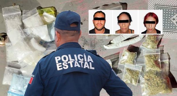 Las personas se identificaron con los nombres de iniciales J. D. P. G., B. C. G. P. y L. C. P. H., y se les encontró en posesión 60 dosis de hierba seca con características de la marihuana, 57 dosis de droga sintética, así como equipo tecnológico.