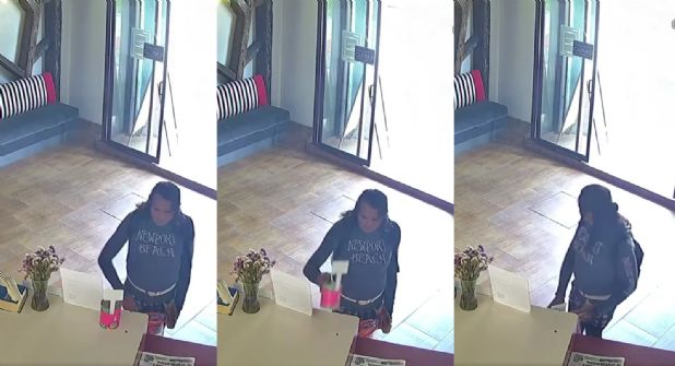 En la grabación se puede ver a una persona con una sudadera azul con la leyenda “Newport Beach” está frente a la caja y observa el bote rosa con un pequeño letrero arriba.