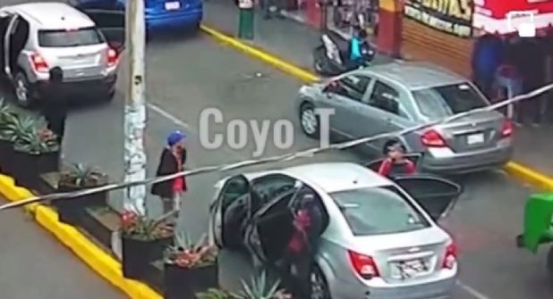 En redes sociales comenzó a circular un video en el que se observa el momento exacto en el que un vehículo avanza sobre una calle del centro de Tecomitl, sin orillarse, se frena y se abren las puertas de ambos lados.