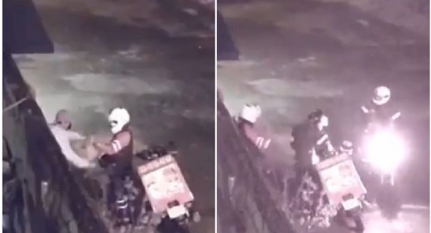 Uno de los ladrones se baja de la motocicleta y se va directo contra el repartidor, quien sólo levanta las manos, le quita el celular y algo que traía en el bolsillo, y posteriormente se sube a la motocicleta, entonces los ladrones arrancan.