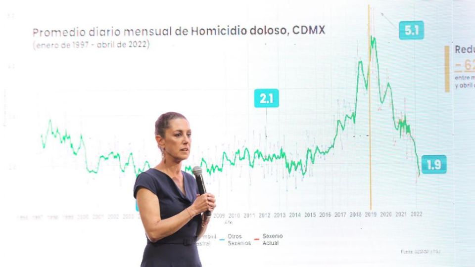 “Asimismo, entre 2019 y 2022 la tasa de homicidios (tasa anual por 100 mil habitantes) ha caído 63 por ciento, es decir, de 16.3 a 5.4 homicidios; la capital pasó de ocupar la posición 11 a la 24 en el país con mayor número de estos delitos”.