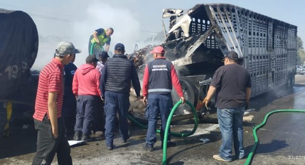 San Francisco Soyaniquilpan, Méx.- Un tráiler con reja, que transportaba reses, se impactó este día en la parte trasera de una plataforma de otro tractocamión, ocasionando que se incendiara con todo y mercancía a la altura del kilómetro 94 de la carretera México-Querétaro en el sentido a la Ciudad de México.