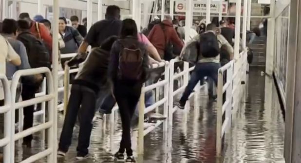 En la grabación, se observa a los usuarios en la estación Buenavista, en su conexión con el Tren Suburbano, tratando de evitar mojarse, por lo que algunos trepan los tubos de acceso para poder llegar a sus destinos.